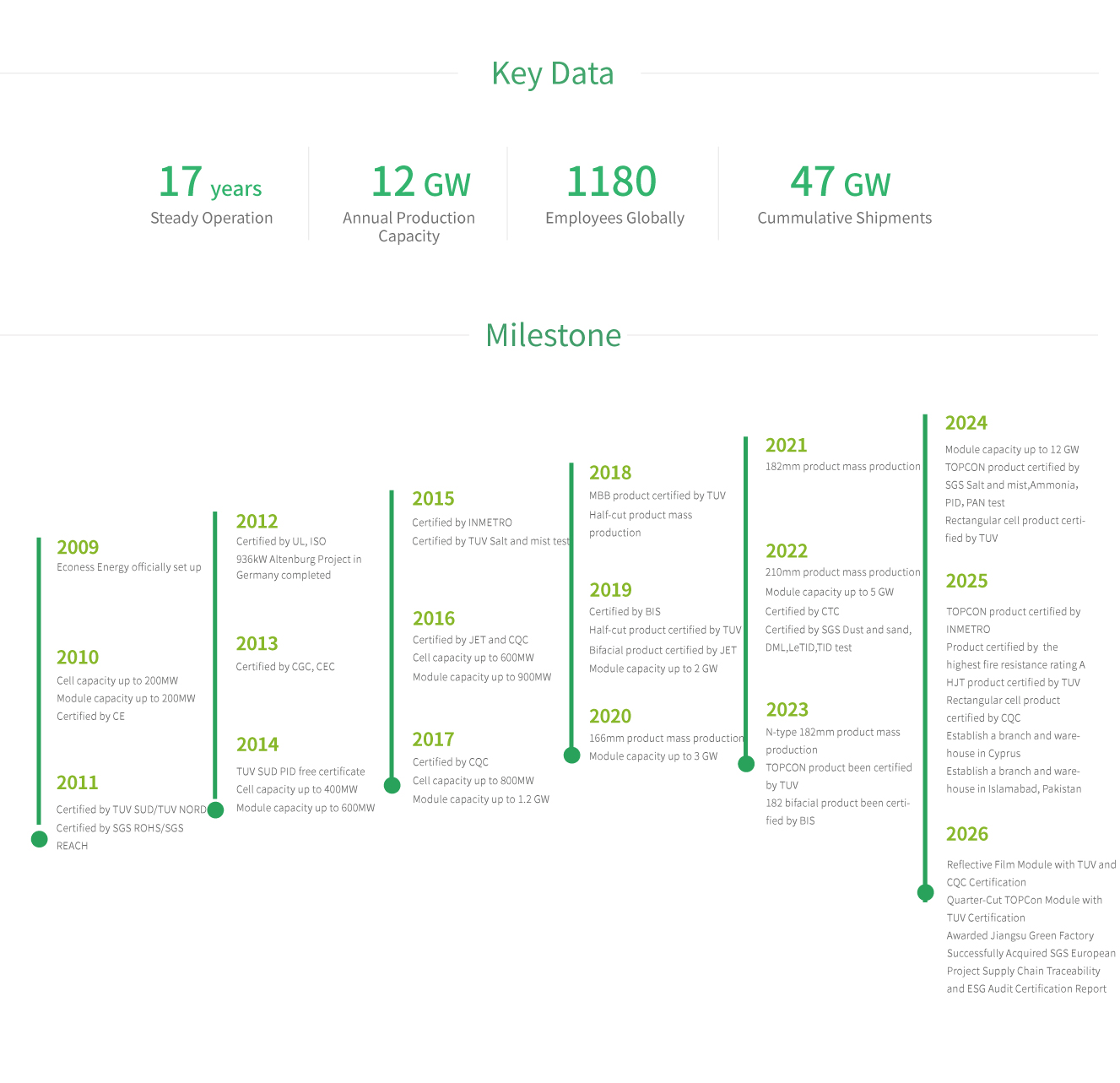 Established in 2009 , Econess Energy is engaged in PV power station development and PV module production. With current annual production capacity of  12GW modules, Econess Energy now distributes its PV products all over the world,such as Germany, Spain, Italy, France, India, Japan ect. As a strong, bankable partner, we are committed to building strategic, mutually beneficial collaboration with installers and developers.